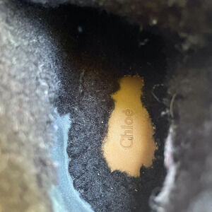 Brown leather with dark brown rubber coated pointed toe, chunky block heel, grip tread sole, black shearling fur lined.