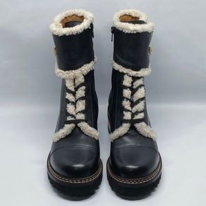 See by Chloe's Mallory combat boots are crafted of smooth leather with genuine shearling trim.