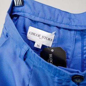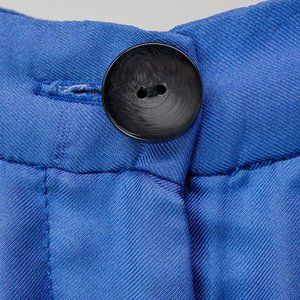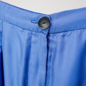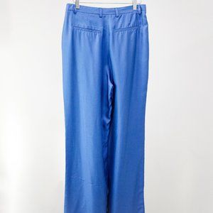 A luxurious high-waisted pant in blue satin silk featuring wide legs, diagonal side slip pockets, belt loops, and a pair of posterior welt pockets.