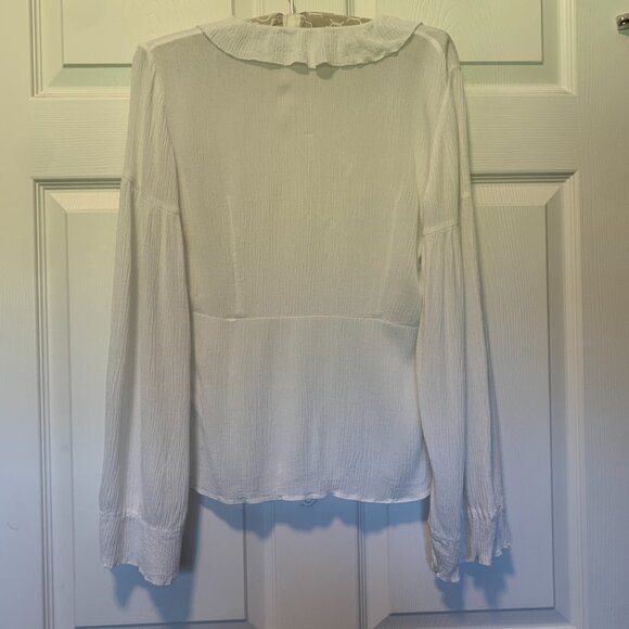 Looking for that perfect, easy-breeze, carefree summer piece? Bring back effortless cool in this vintage 90s Chloe blouse. Featuring long, bell-shaped sleeves, a deep V with string tie, ruffled collars/sleeve hem, and lightweight gauze fabric. Excellent* condition with slight marking on clothing tag (not noticeable at all when wearing).