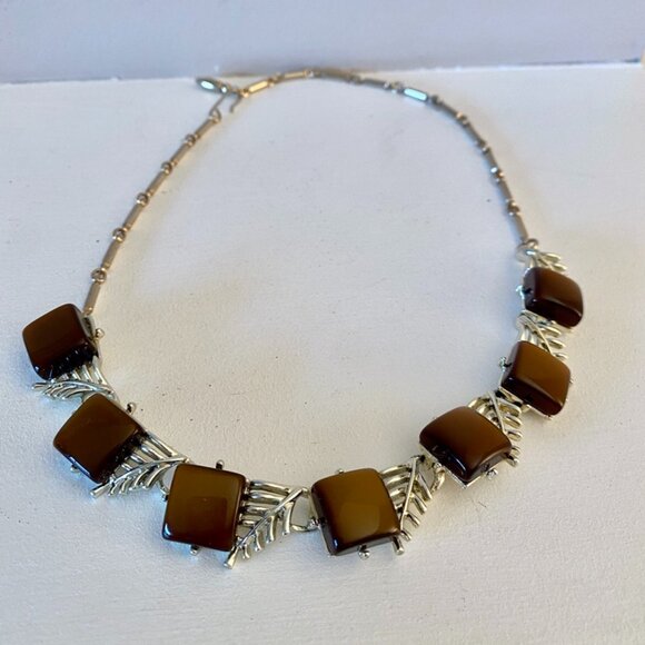 Brown shimmery chocolate thermoset squares with silver coloured leaf chain necklace with hook closure from the late 1950s. Excellent used vintage condition. At longest hook length it falls 8 inches long, at its shortest it falls 6 inches long. Cat friendly, nonsmoking home.