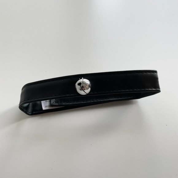 Black choker with a bell attached and a velcro strap on the back making it adjustable for everyone.