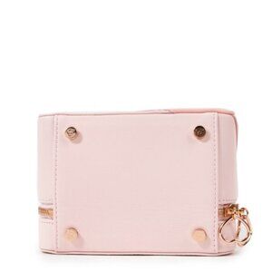 The cubic and geometric shape of the bag blends artfully with the soft curves of Chopard’s emblematic heart motif. In soft pinks, the bag has an additional chain to carry it across the body.