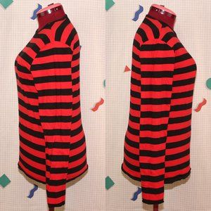 Reversible long sleeves tee from Chor. One side features black and red strips with unfinished edges, and the other side is solid black with a printed skull on the left shoulder. Never worn, washed once. Made in China. 100% cotton. Measurements lying flat are: 18½"(37") for bust, waist and hips. Fabric has a 35% stretch limit. Comes from a smoke-free home that has pets. Tags: punk, goth, y2k, alternative, grunge