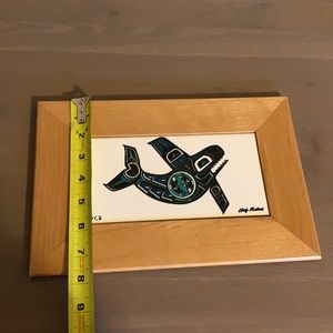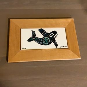 EUC wooden framed white, black, and teal orca whale art print tile by Alaskan artist Chris Mahan.