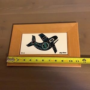 Chris Mahan Wooden Framed White, Black, and Teal Orca Print Art Tile