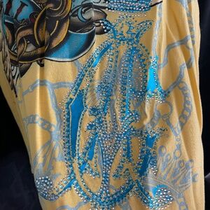 Excellent condition, worn a few times. Has subtle stains in a few areas (see photos), should easily come out. Slightest thread loosening in one arm (see photo). Size XL