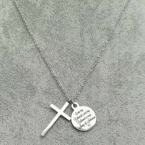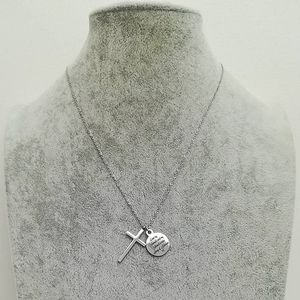 A stainless steel necklace with a stainless steel cross charm, and a laser engraved stainless steel scripture charm. 15.7" long with an additional 2" extender chain for an adjustable length.