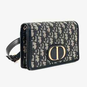 Circa 2022, this 30 Montaigne pouch from Christian Dior is crafted in a blue Oblique-pattern canvas, and features navy leather trim, gold-tone hardware, a removable chain crossbody strap, a removable belt, "30 Montaigne" embossing, a back slip pocket, and a "CD" motif on the front. Secured with a snap closure, the front flap opens to a navy leather and black textile-lined interior containing a slip pocket, a zip pocket, and four card slots.