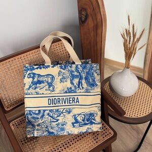 The beige cotton handle/strap adds a touch of elegance to the designer bag, which is part of the chic Dioriviera theme.