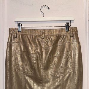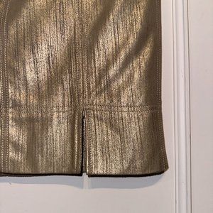 This knee length pencil skirt from Christian Dior is made in a metallic gold goat suede, and features a front snap and zip fly, belt loops, front frogmouth pockets with a right coin pocket, back patch pockets, back slits, and is lined in a champagne-coloured satin.
