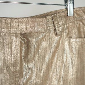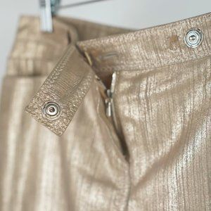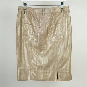 This knee length pencil skirt from Christian Dior is made in a metallic gold goat suede, and features a front snap and zip fly, belt loops, front frogmouth pockets with a right coin pocket, back patch pockets, back slits, and is lined in a champagne-coloured satin.