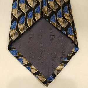 Blue, gold, black and gray intertwining pattern. 100% silk. Made in Canada.