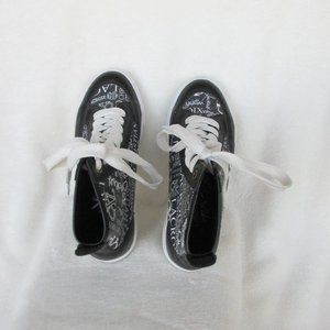 These high-top, lace-up shoes are in very good used condition, please see photos of black rubbing on inside left shoe foxing, and small areas on the black part of the shoe that have white-ish spots.