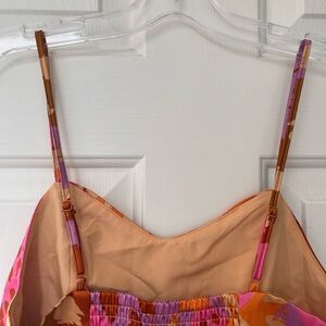 Brighten up your wardrobe with this striking abstract print cami top by Christian Lacroix. This vibrant crop top features a painterly mashup of hot pink, orange, tan, and purple on a silky, lightweight fabric. Designed with adjustable spaghetti straps, a sweetheart neckline, and stretchy smocked panel at the back for added comfort and a flexible fit. Fully lined.