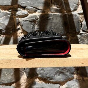 Structured rectangular silhouette. Embossed black calf leather with patent leather panels at sides. Black Loubinthesky embellishments and signature stud details at front and top. Fold-over flap with magnetic closure. Removable gunmetal-tone chain shoulder strap with leather pad. Branded hardware. Interior lined in signature red leather with multiple card slots, zip pocket, and slip compartment. Signature Christian Louboutin embossed logo at interior. Finished with a discreet red enamel logo at the back. Made in Italy. Comes with original box and dustbag.