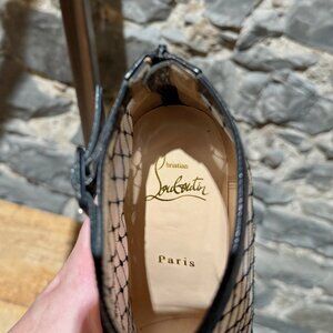 Smooth black leather with rigid mesh fishnet inserts. Pointed toe with a concealed platform. Very high stiletto heel. Signature red lacquered sole. Decorative buckle ankle strap. Back zip. Leather outsole, insole and lining. Made in Italy. Come with branded dustbags.
