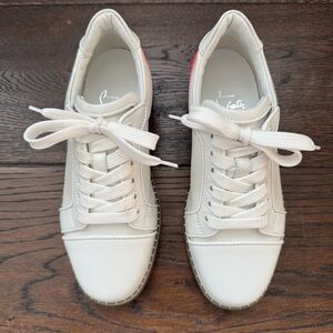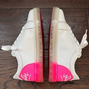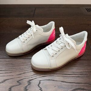 Forever a favorite, the Fun Vieira sneakers from Christian Louboutin are reintroduced with transparent rubber soles and logo-branded neon pink heel counters. Made in Italy, the perforated leather uppers are accented with tonal laces and grosgrain ribbon trims.