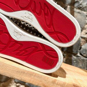 Platform sneakers. Leather upper. Gold-tone spike accents. Round toe. Beige leather insoles. Rubber soles. Signature red outsoles. Made in Italy. Come with dustbags.