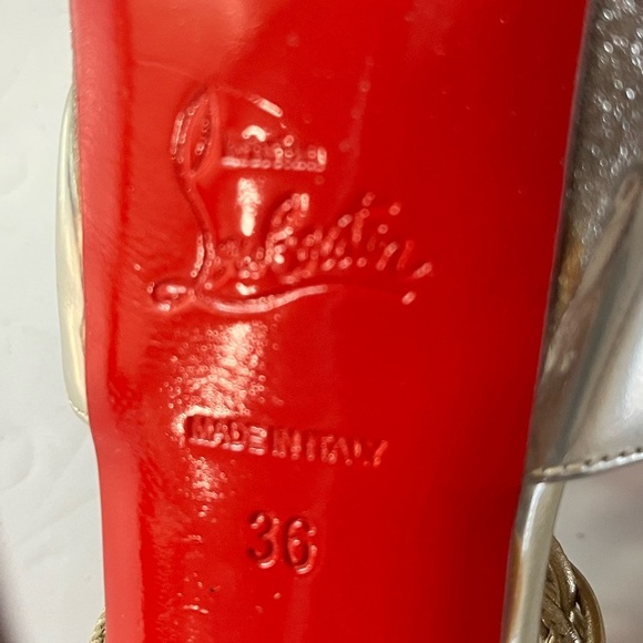 • Condition: Pre-owned with scuffs, wear to the gold finish (notably on the platform—see photos), and minor signs of use on the interior and soles. Includes original Louboutin red dust bag.