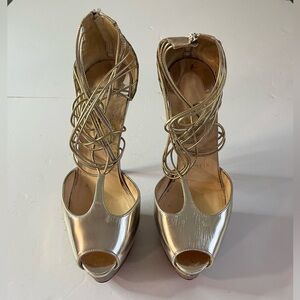 • Design: Lace-up ankle straps, peep toe, and platform for added height