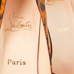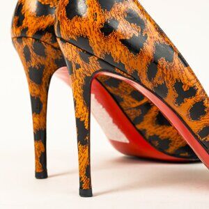 These pumps from Christian Louboutin are crafted in a cheetah-print patent leather, and feature covered mid-heels, closed pointed toes, leather lining and insoles, and the designer's iconic red bottom soles.