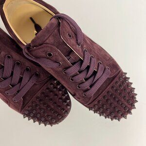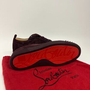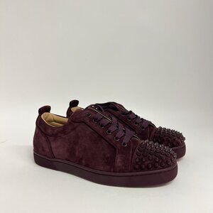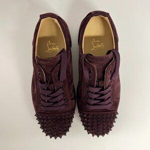 These Christian Louboutins are in brand-new condition, they have never been worn. Made in a deep burgundy plum shade suede exterior with stud-covered toes. The interior lining is made from supple beige leather and the rubber outsole comes in the unmistakable Louboutin red.