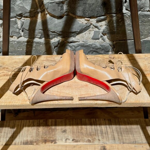 Platform sandals. Beige nude leather upper. Round open toe. Lace-up closure with tassel details. Stiletto heels. Beige leather sole. Red signature soles. Made in Italy. Come with a dustbag and the original box.