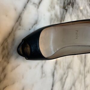 Black leather with 5" heels. Small platform, see photos. Size 40. Peep toe. Worn 3 times.