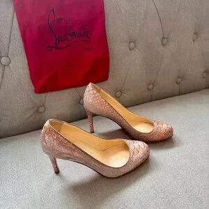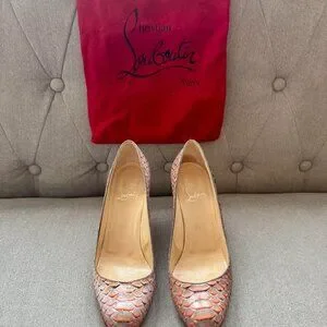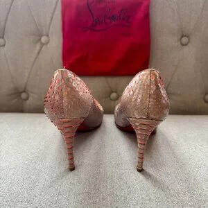 Christian Louboutin python‑embossed leather pumps in multitone orange/beige/pink snakeskin‑look leather. Classic stiletto heel. Heel height is 3.5 inches. Professionally added red rubber protective soles to extend the life of the shoes. Includes dust bag.