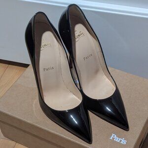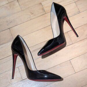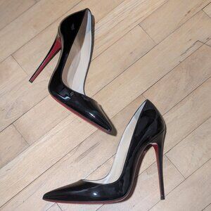 The So Kate iconic pump with timeless elegance brilliantly combines discretion and sophistication. Its all black patent calfskin features a sculpted upper that extends its lines to the iconic bold cut. It sits easy atop a slender 120 mm heel to give you confidence, underlining Maison Christian Louboutin know-how.