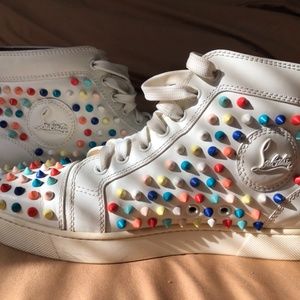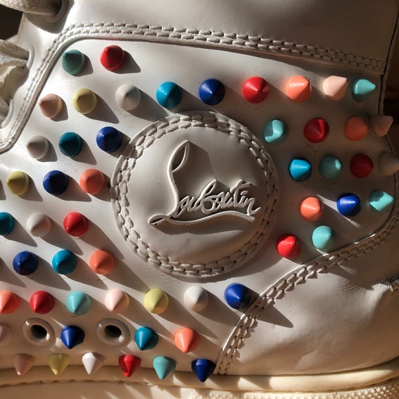 High top White leather and coloured studded Louboutin sneakers. Size 40. Slightly worn and well taken care of