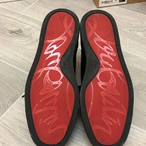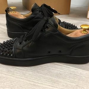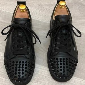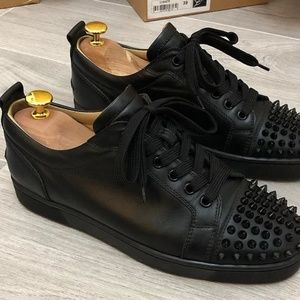 Black calf leather with shiny black spikes, has light creases and marks to the soles, still in great condition.