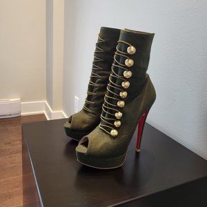 Christian Louboutin peep toe dark green felt platform booties with gold buttons