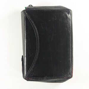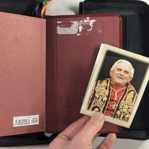 A Christian prayer book with black leather cover. Both with damages as pictured and in need of TLC