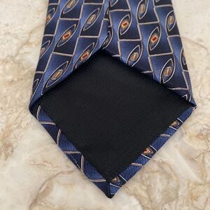 In excellent preowned condition gorgeous Christian Dior 100% silk tie. Elegant shades of blue with bits of red and gold throughout an eye catching pattern. Absolutely beautiful!