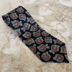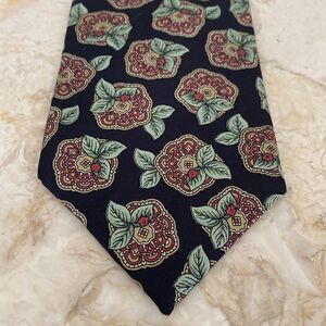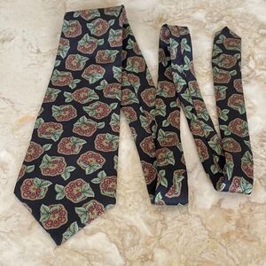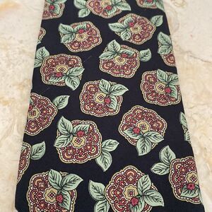 Gorgeous Christian Dior 100% silk tie featuring an eye catching pattern. Black background highlights a unique floral pattern of green, red and tan tones.