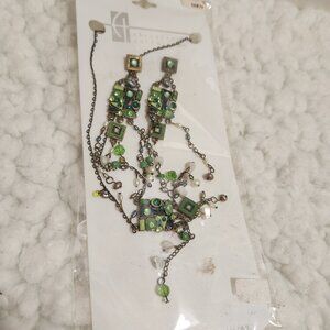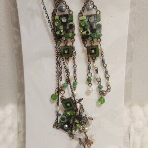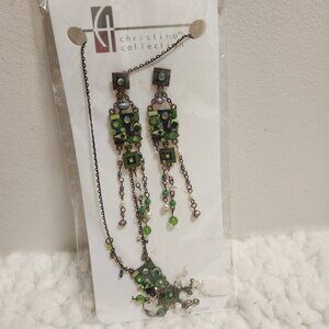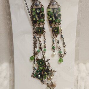 The earrings feature a 4-inch beaded chain with pierced backs, allowing the green mosaic accents to gently swing and catch the light. The necklace has a 14-inch antique-style chain with a 3-inch hanging mosaic pendant, showcasing a beautiful combination of greens in a classic, artisanal design. The antique-style chain adds a vintage-inspired touch, enhancing the overall elegance of the set.