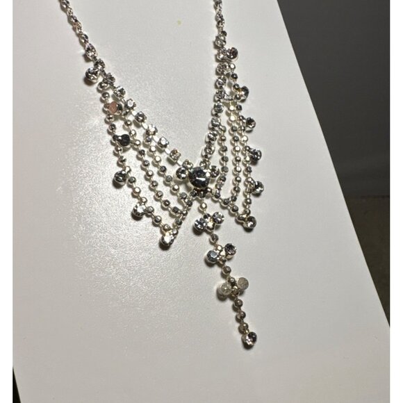 This elegant silver-plated necklace and earrings set features cascading crystals, adding sophistication to formal or evening wear.