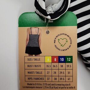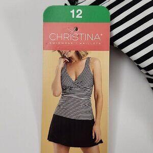 New with tags, Christina women's 2 piece black stripes on white tankini top with black swim skirt, size 12.