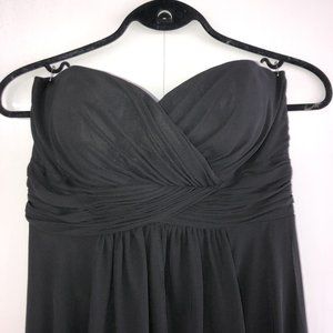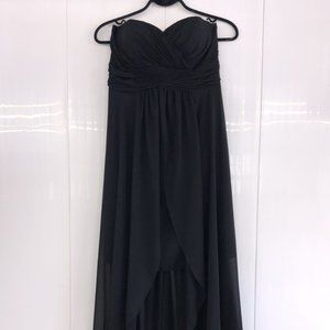 This bridemaid dress features a strapless sweetheart neckline, pleated cummerbund short sheath skirt with long A-line overlay.