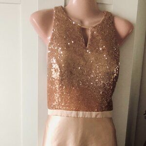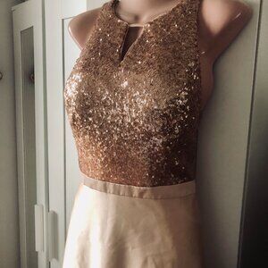 👗 Elegant blush pink gown with shimmering gold sequin bodice and silky satin skirt.