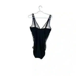 This attractive, black and white bathing suit is in excellent used condition. It has soft cups and an elastic band under the bust line and around the back.