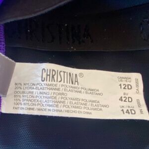 Christina one piece swimsuit, size 12D, purple in colour. Worn a few times, very.slight pilling on butt from sitting down. Very good to excellent used condition. Adjustable straps. 80% Nylon Polymide, 20% Lycra Elastane. Waist unstretched 28” , Hip unstretched 32”