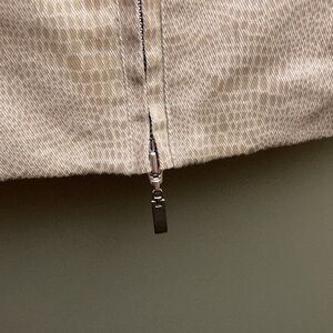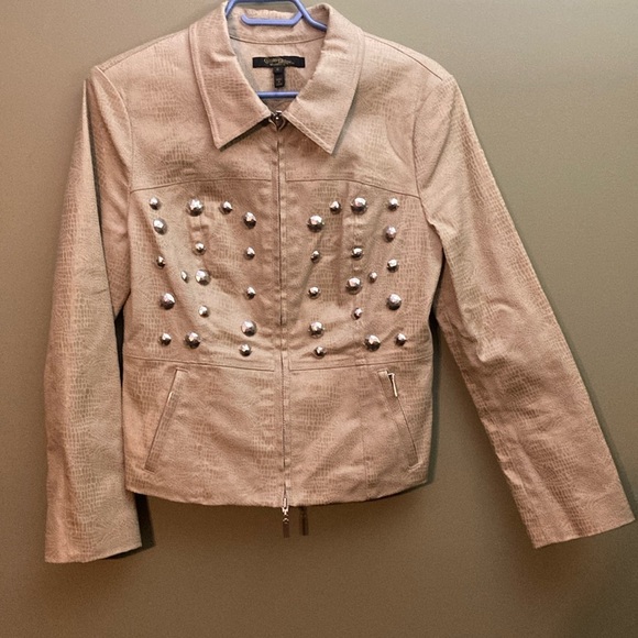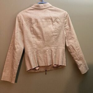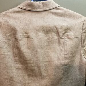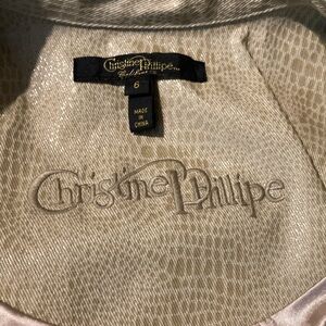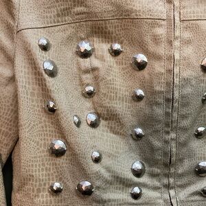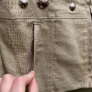 Christine Phillipe gold crop jacket with big sewn on buttons. In great shape. Leopard style print on it. Pockets do zip closed. The zipper opens at both ends. Cinched in waist. It is supposed to be hand washed.