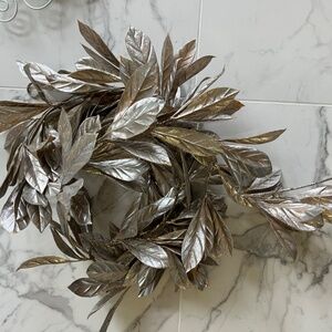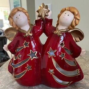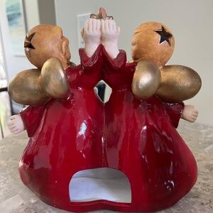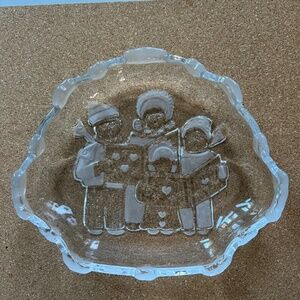 A wonderful assortment of Christmas treasures!! Cut glass candy dish; tin snowman votive holder; collector vintage Libbey Coca Cola Christmas tumbler; 5 foot 'metallic' garland; metal snowmen door chime with bells; small ceramic flower pot; ceramic twin angels votive holder; large plastic sparkling ornament; copper angel candle holder. All from a smoke free home.