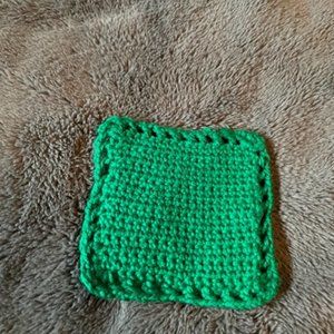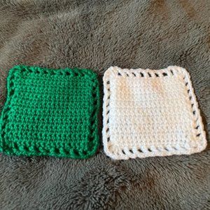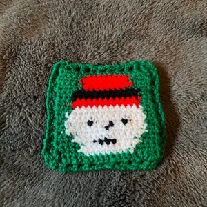 Two new handmade Christmas coasters one is a snowman on green background and second one is a candle on white background. Made from 2 squares each that have been crocheted together. The front is patterned, the back is plain. Each square measures approximately 5" x 5". Can be used as a coaster or part of your holiday decor.
