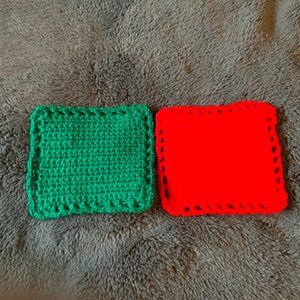 Each coaster is made from 2 squares each that have been crocheted together. The front is patterned, the back is plain. Each square measures approximately 5 1/2" x 5 1/2"