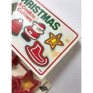 Two packets of vintage Christmas cookie cutters. Fox run craftsmen 1987 tin cookie cutters in box are preowned. Box has some staining and some tape on it. Hutzler Yule cheer plastic cutters are still in their package from 1997. Packaging show some wear. Both are proudly made in the USA!