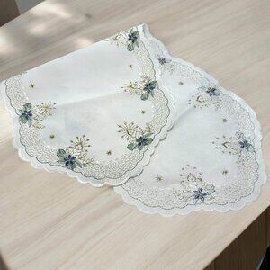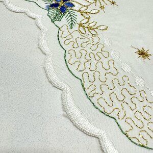 Christmas Embroidery Table Center Satiny Ivory w/Gold Candles Scalloped Edge